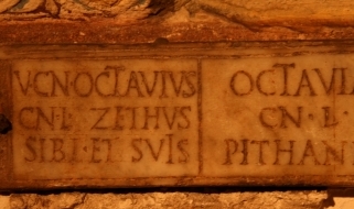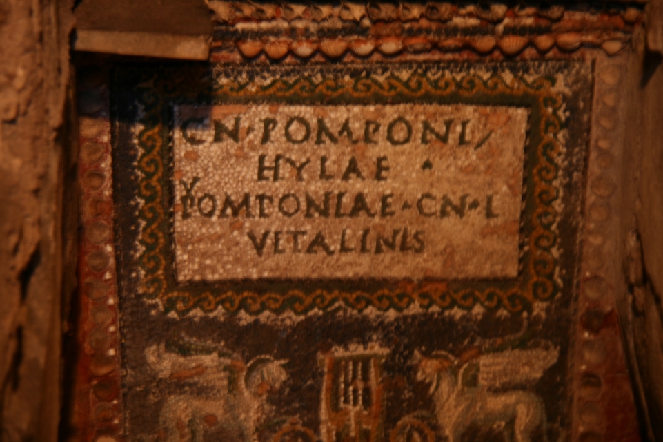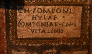 Ma se questi erano i fondatori … da dove deriva il nome con cui conosciamo oggi il colombario? Chi era Pomponio Hylas? Ancora una volta, ci vengono in aiuto le bellissime decorazioni di questo piccolo ambiente sotterraneo: appena scesi nell’ambiente ipogeo infatti, proprio di fronte alla scala, saremo colpiti da un bellissimo emosaico parietale in pasta vitrea e concrezioni calcaree, uno dei più antichi rinvenuti in Italia, posto a decorazione di una delle nicchie che ospitavano le ceneri; sotto la nicchia, l'iscrizione a mosaico coi nomi dei defunti: Cn(aei) Pomponi Hylae e Pomponiae Cn(aei) L(ibertae) Vitalinis. Pomponio Hylas era dunque un liberto - uno schiavo liberato -, deposto qui insieme alla moglie nel I sec. d.C.