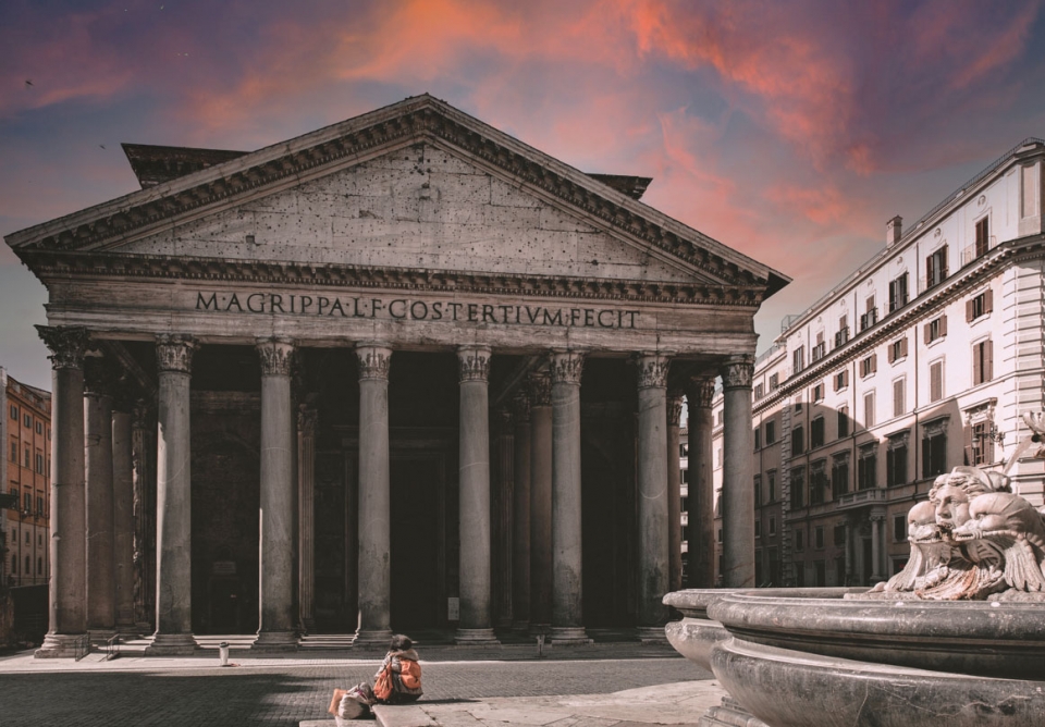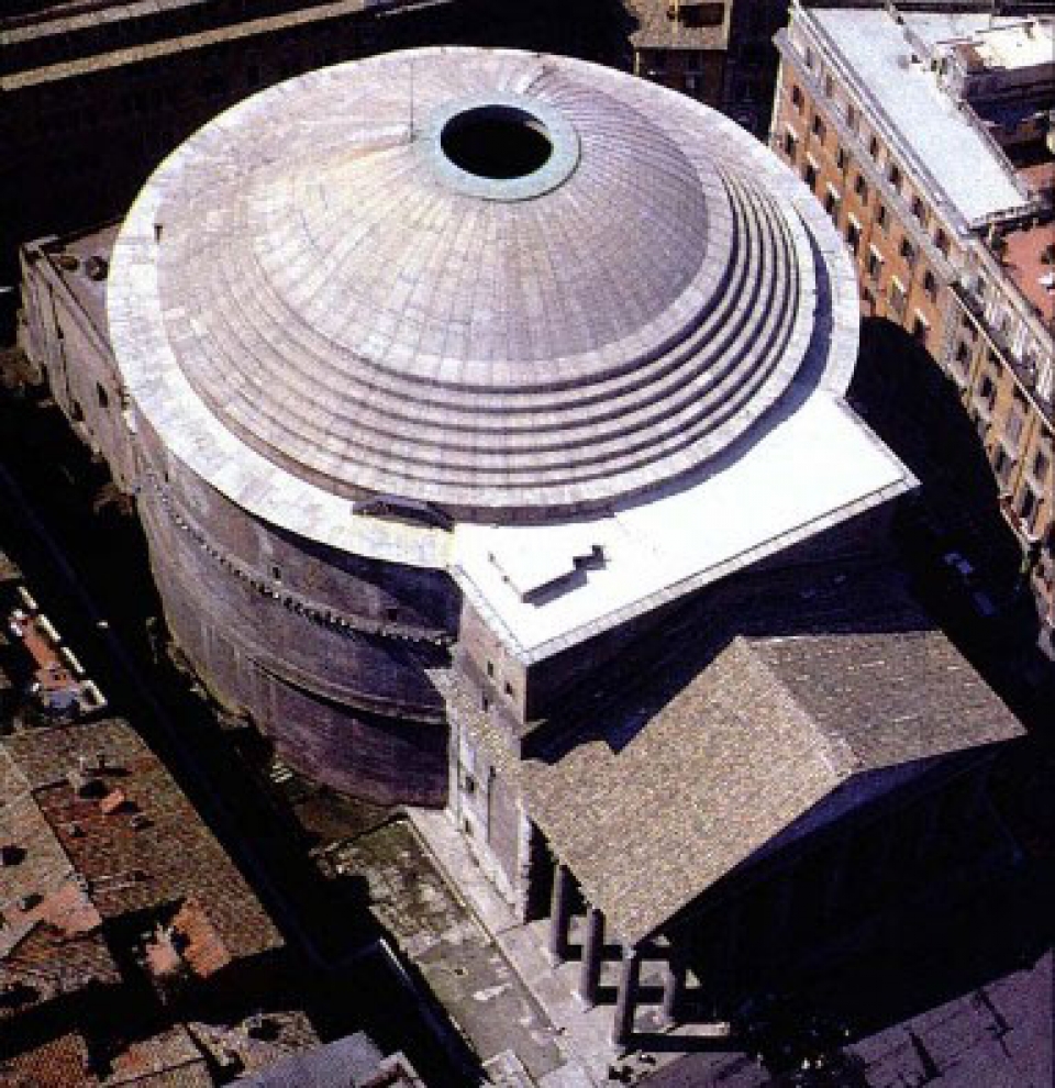 Il Pantheon è sicuramente il monumento più famoso e rappresentativo della Capitale, insieme al Colosseo. Costruito da Agrippa, amico, collaboratore e genero di Augusto durante la fase di monumentalizzazione della pianura del Campo Marzio e riedificato da Adriano con le forme attuali, il monumetno diviene una chiesa cristiana tramite la donazione dell'imperatore Foca al Papa, nel 609 d.C.