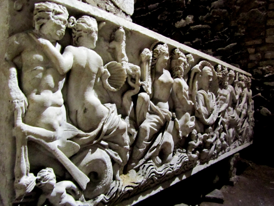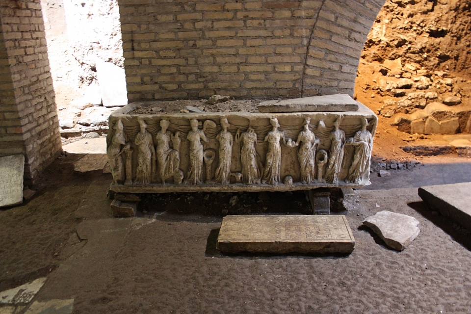Passeggiando sotto la chiesa moderna non potremo poi non rimanere affascinati dalle antiche sculture come i sarcofagi finemente decorati a rilievo e le iscrizioni sepolcrali: decorazioni originarie della prima chiesa, che raccontano storie private di uomini antichi.