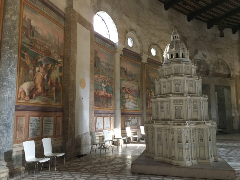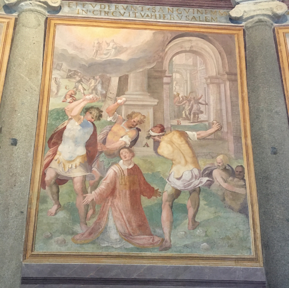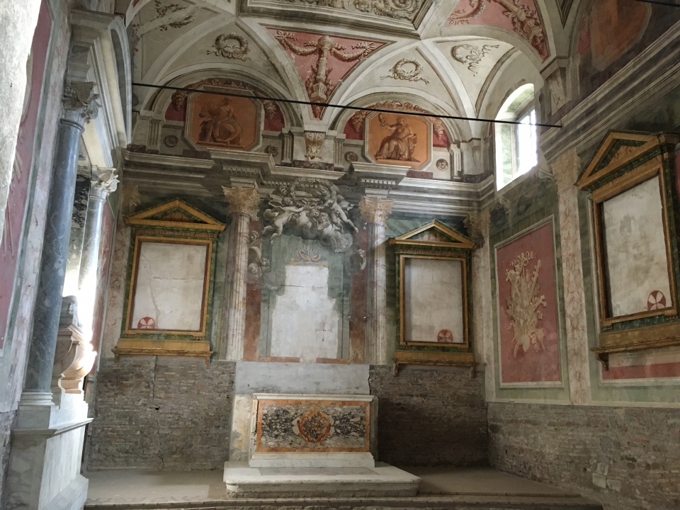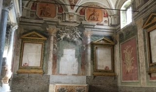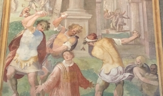 La visita, però, non sarà incentrata solo sulla prima fase costruttiva della chiesa, ma anche sull’episodio decorativo più importante, che ne modificò completamente l’aspetto: le sconvolgenti pitture realizzate nell’ambulacro dal Pomarancio a partire dal 1583. Incentrate sulla tematica del “martirio” i dipinti dell’artista toscano ancora oggi colpiscono come un pugno nello stomaco per la loro violenza e il loro realismo: vera e propria “enciclopedia degli orrori”, il “martirologio” è basato su 34 trucide scene di massacri compiuti sui cristiani delle origini. Questa strana enciclopedia ha colpito i viaggiatori e gli scrittori di tutte le epoche, tra cui Goethe, Stendhal, De Sade, e noi cercheremo di osservarla assieme senza essere travolti dalla sua forza brutale.