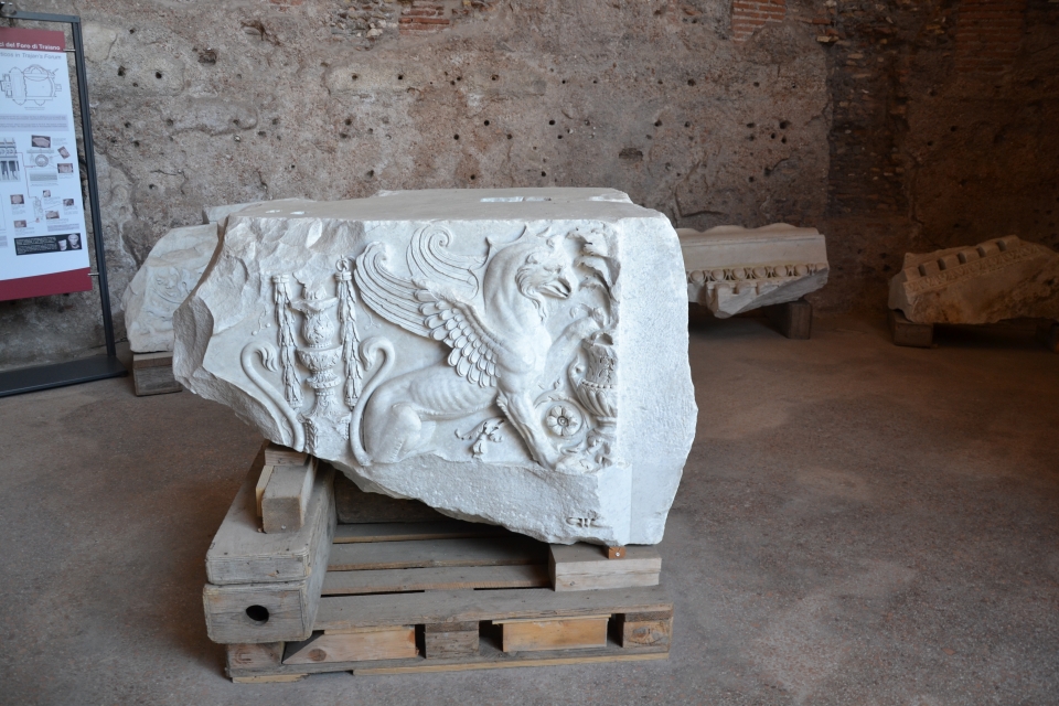 Il complesso è formato da tre grandi blocchi di edifici separati, ognuno con una funzione diversa, ma tutti collegati dall’esterno da strade basolate: gli edifici, vicinissimi all’area del Foro di Traiano, erano infatti utilizzati per questioni politiche e amministrative, strettamente collegate con l’esercizio della giustizia all’interno del Foro di Traiano. Entrando dal livello della moderna via di IV Novembre, saremo accolti nella cosiddetta “Grande Aula”: un ambiente altissimo, con due file di piccoli uffici ai lati e un grande spazio vuoto al centro che ci proietterà sin dall’inizio nella magnificenza di queste architetture. Da questo livello, attraverso le antiche scalinate dagli altissimi gradini, potremo raggiungere il livello sottostante, uscire all’aperto e passeggiare sui basoli dell’antica via Biberatica, strada che dobbiamo immaginare un tempo affollatissima e freneticamente attraversata da chi dai Fori Imperiali si recava negli uffici amministrativi o da chi semplicemente, tenendosi alla larga dalla vita politica dell’impero, voleva raggiungere il quartiere popolare alle spalle dei mercati. Scendendo ancora più giù raggiungeremo infine il livello dell’antico Foro di Traiano e, senza entrare al suo interno, daremo uno sguardo a tutti i piccoli ambienti che si trovavano alle sue spalle e che oggi ospitano sculture provenienti dal foro.