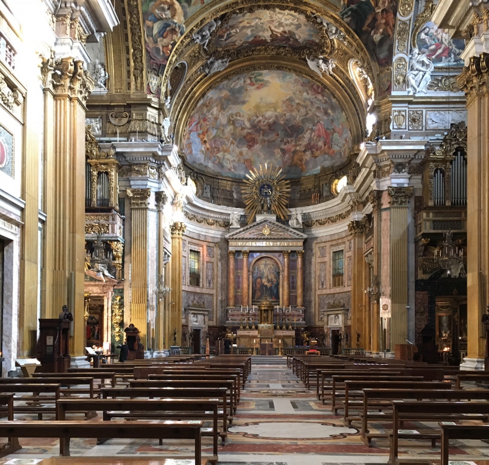 Tra le chiese più spettacolari di Roma figurano sicuramente le due fondazioni gesuite della capitale: la Chiesa del Gesù, voluta da Ignazio di Loyola e costruita a partire dal 1568, e la chiesa di Sant’Ignazio di Loyola, costruita nel 1626 come cappella ad uso degli studenti del Collegio Romano. Entrambe le costruzioni rispondono architettonicamente ai dettami della Controriforma e le loro articolate decorazioni offrono esempi magistrali della coreografica arte barocca. Punto culminante delle due chiese sono gli affreschi che attuano illusionistici sfondamenti prospettici dei soffitti: il Trionfo del Nome di Gesù realizzato dal Baciccio e la Gloria di Sant’Ignazio, assieme alla finta cupola dipinta, entrambi realizzati da Padre Andrea Pozzo nella chiesa di Sant’Ignazio.